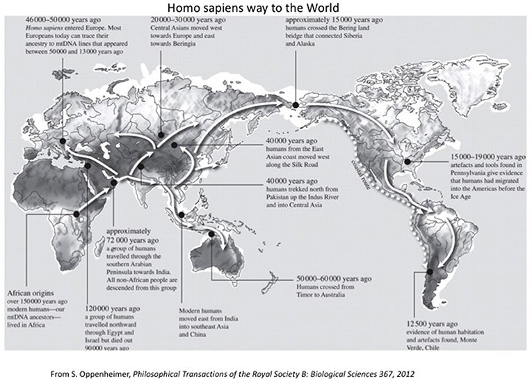 Fossils recently discovered in Morocco (North Africa) have added to the intense debate on the spread of H. sapiens after they originated 315,000 years ago [8]. The location of these fossils could mean that Homo sapiens had visited the whole of Africa. In the same way, the scattering of fossils out of Africa indicated their migrations to various continents [9]. While intensely debated, hypotheses focus on either a single dispersal or multiple dispersals out of the African continent [10, 11]. Nevertheless, even if the origin of the migration to Europe is still a matter of debate [12], it appears that H. sapiens was present in Israel [13] 180,000 years ago. Therefore, it could be that migration to Europe was not directly from Africa but indirectly through a stay in Israel-Asia. They arrived about 45,000 years ago into Europe [14] where the Neanderthals were already present (see above). Studies of ancient DNA show that H. sapiens had babies with Neanderthals and Denisovans. Nowadays people living in Europe and Asia share between 1 and 4% of their DNA with either Neanderthals or Denisovans [15].